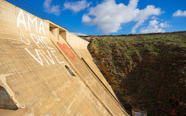 Presa de Mala, Staudamm von Mala, Haría, Lanzarote Lage & Namen Die Presa de Mala liegt oberhalb des Ortes Mala im Norden Lanzarotes, Gemeinde Haría. Die Staumauer sperrt einen Abschnitt