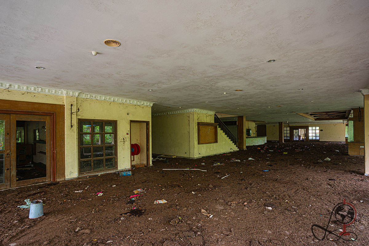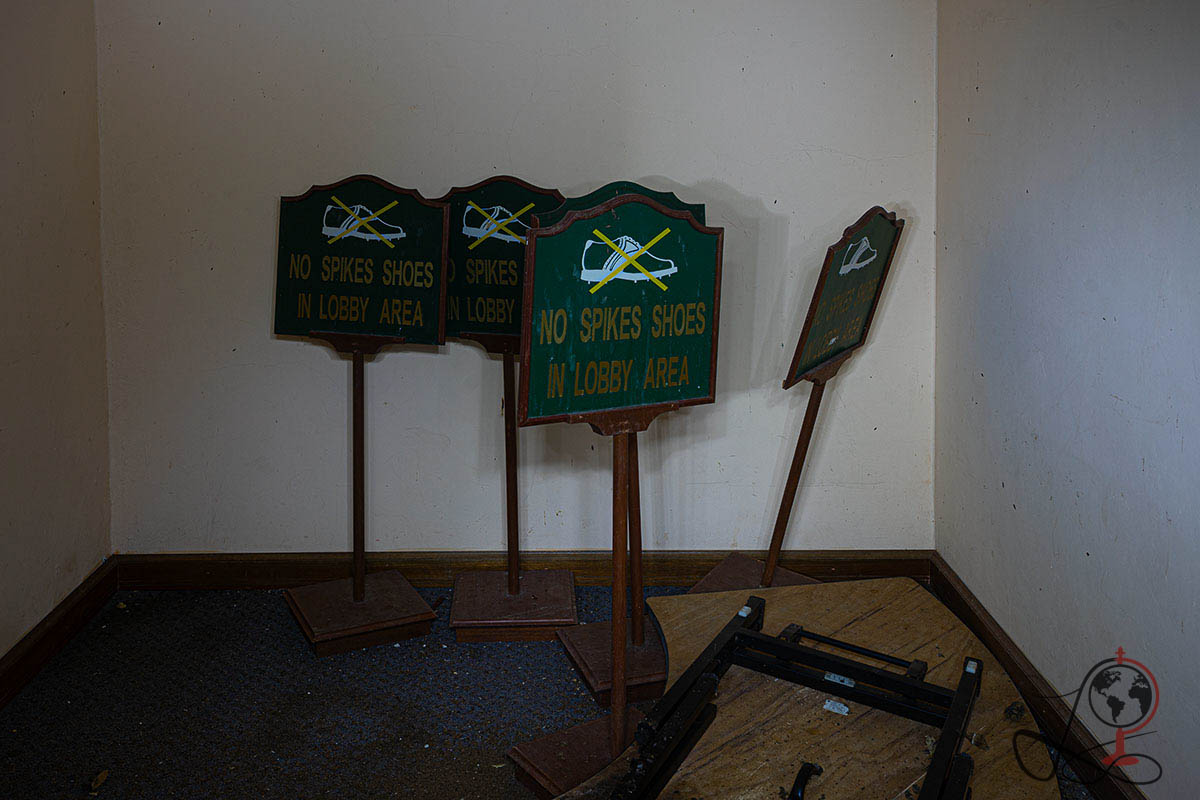 Die sichtbare Beschilderung vor Ort passt genau zu einer klassischen Clubhauslogik im Golfsport. Anmeldung, Wegeführung zum Abschlag, Umkleiden und Pro Shop sind keine Einzelräume ohne Zusammenhang, sondern Teil eines klar organisierten Betriebs. Das ist auf den Bildern noch gut erkennbar. Dadurch wirkt die Anlage nicht wie ein beliebiges verlassenes Gebäude, sondern wie ein ehemaliger Freizeit und Servicekomplex mit festem Ablauf für Gäste und Spieler.