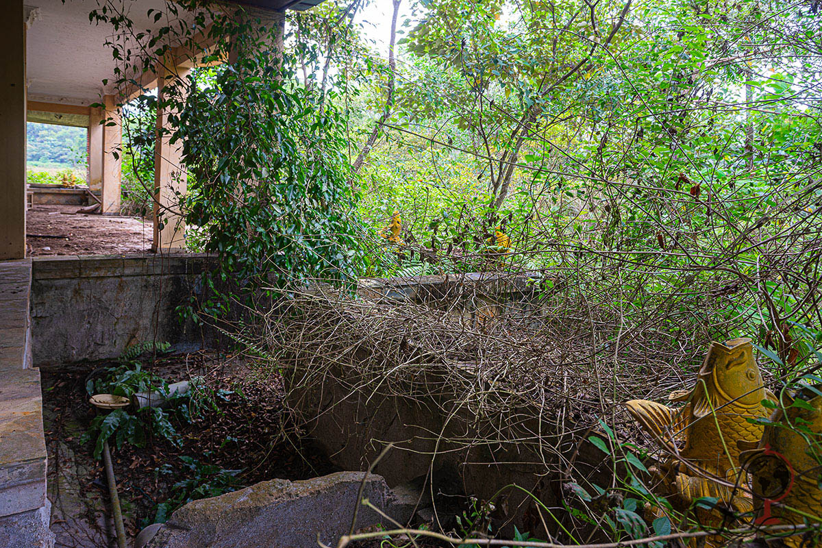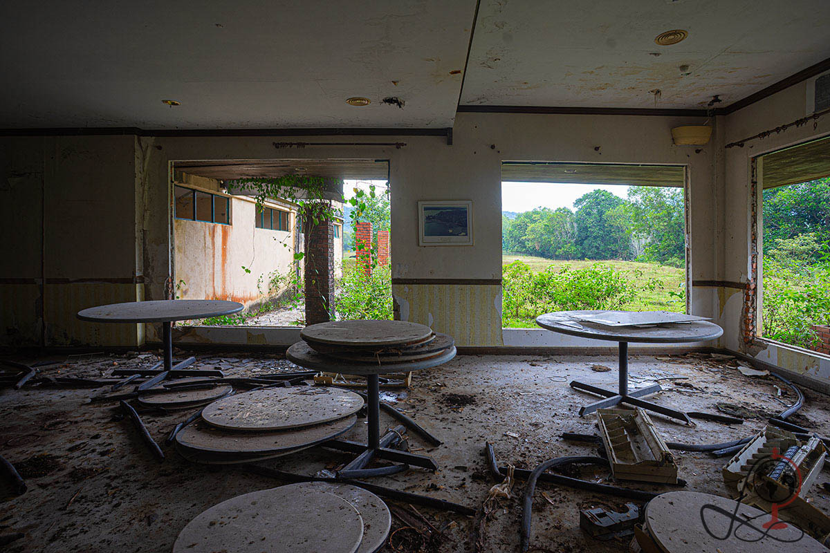 Bei meinem Besuch im Jahr 2024 wirkte der Ort auf mich nicht wie eine vollständig verschwundene Anlage, sondern wie ein angehaltener Betrieb. Die Beschilderung, die Raumaufteilung und die erhaltenen Servicebereiche erzählen bis heute sehr klar, wie hier einmal Bewegung war. Gleichzeitig liegt über allem diese dichte tropische Ruhe, in der Wasser, Pflanzen und Licht den Raum langsam übernehmen.