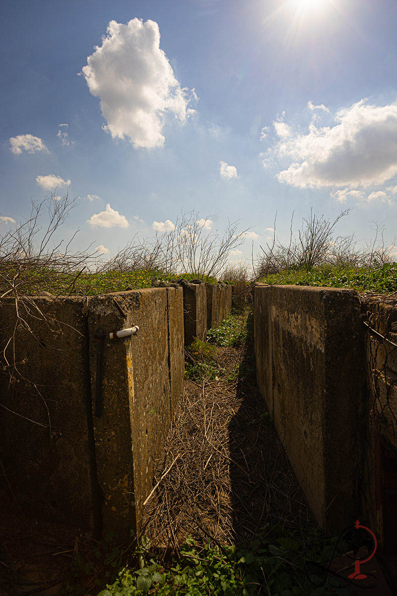 Die Lage ist nicht zufällig gewählt. Höhenpunkte sind in Grenzräumen immer Beobachtungsposten. Auf den Fotos sieht man es deutlich: Schützengräben aus Beton, ehemalige Unterstände und Blickachsen, die weit über das offene Land greifen. Dazu kommt ein Turmgerüst als klassischer Punkt für Sicht, Meldung und Kontrolle.