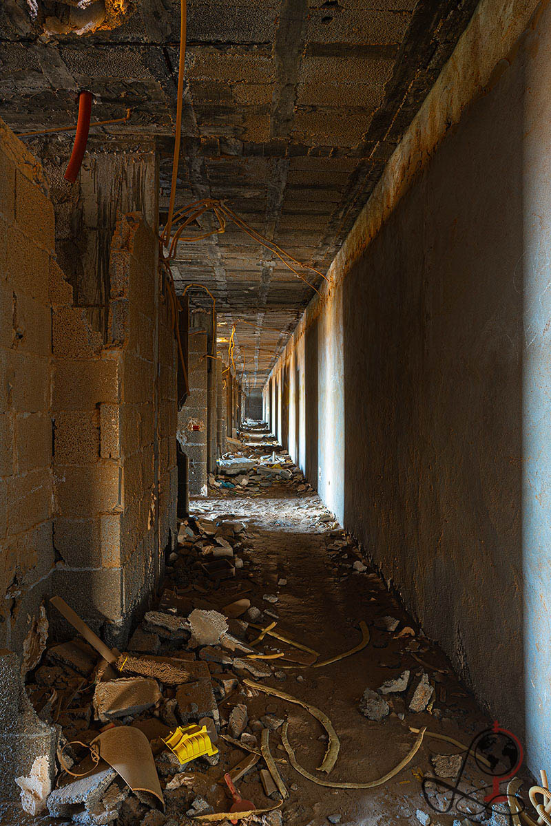 Ich war 2026 bei Sonnenaufgang vor Ort. In diesem Licht wirkt der Rohbau noch massiver, weil Konturen, Bruchkanten und leere Fensteröffnungen stärker hervortreten als am Tag. Der Komplex zeigte deutlich sichtbare Schäden und instabile Bereiche. Ein Ort, der fotografisch extrem stark ist, aber dessen Zustand den Respekt vor jedem Schritt erzwingt.