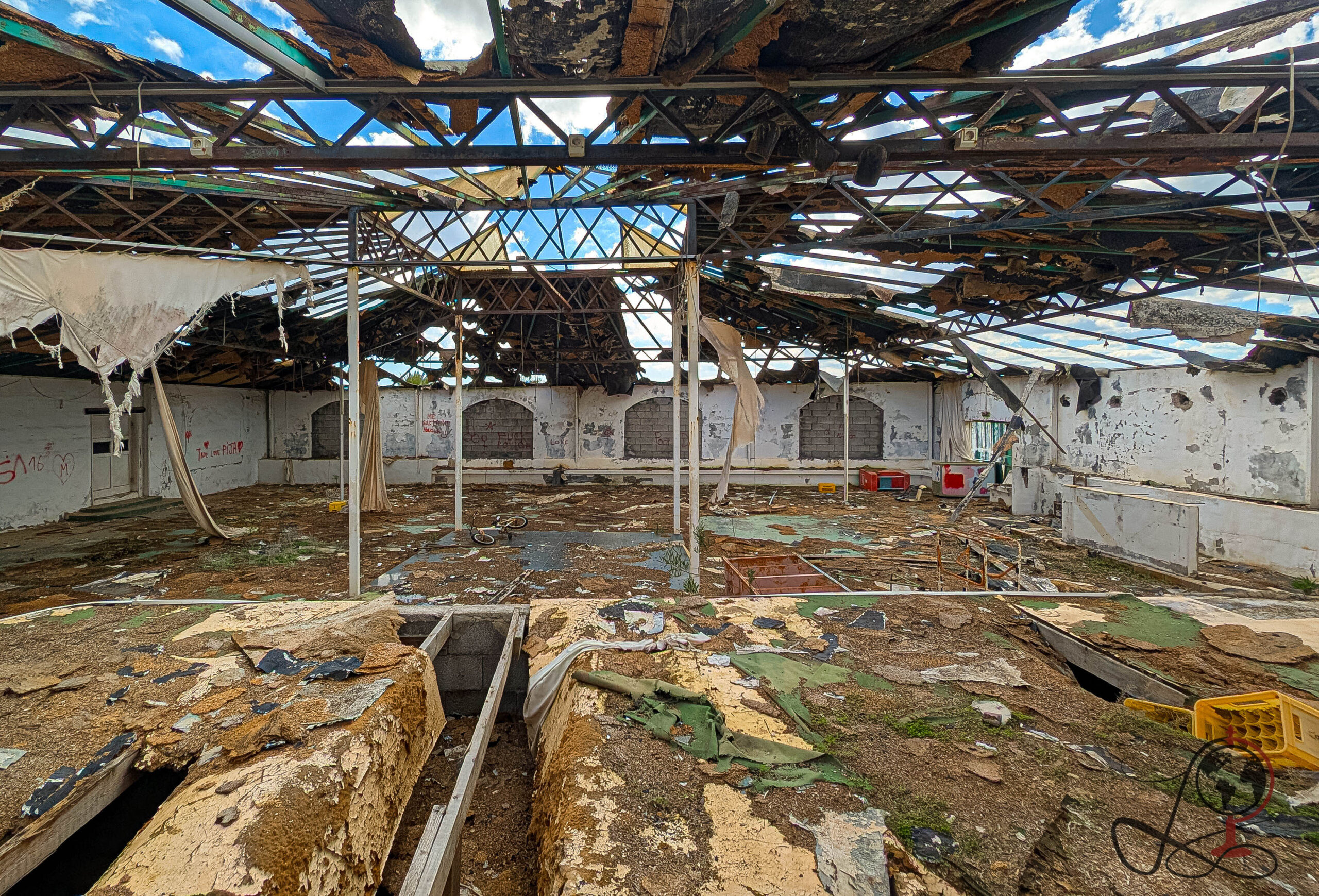 Der Verfall ist hier nicht dekorativ, sondern konsequent. Ein Teil der großen Halle steht unter einem offenen Dachgerippe, Stoffreste hängen wie Fahnen in den Streben, und am Boden liegt, was von Bodenbelägen, Deckenmaterial und Inventar übrig blieb. In den Nebenräumen blättert die Farbe, Fenster sind gebrochen, und die Landschaft drückt an vielen Stellen zurück in die Architektur.