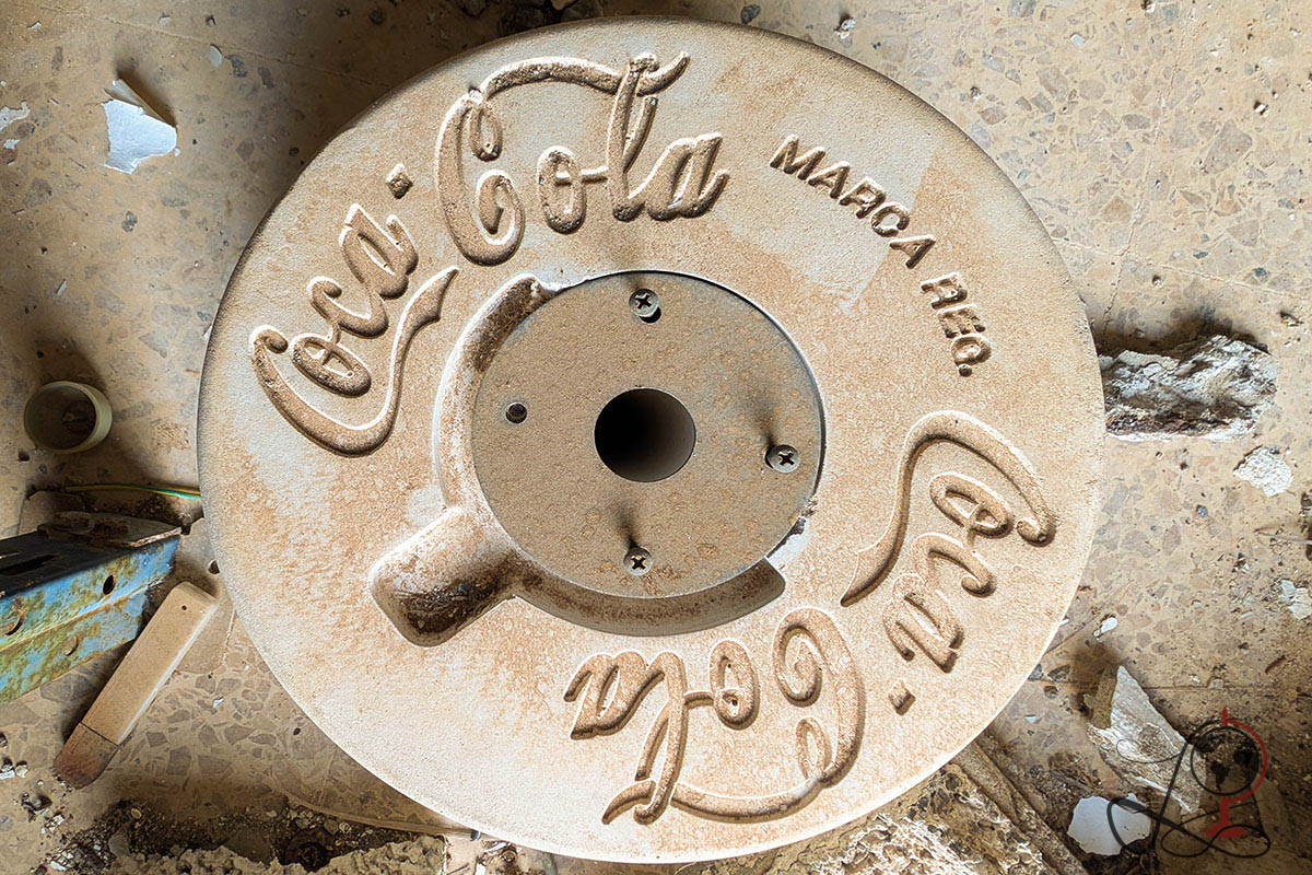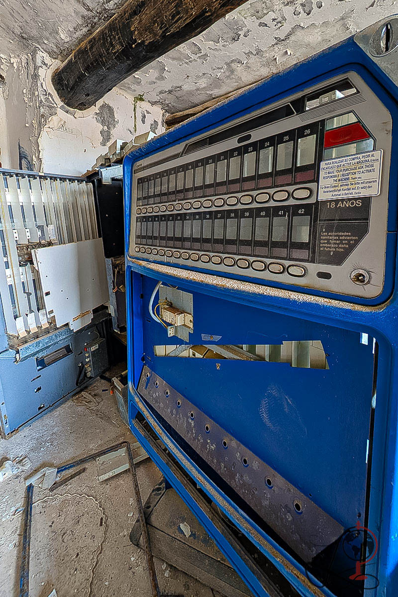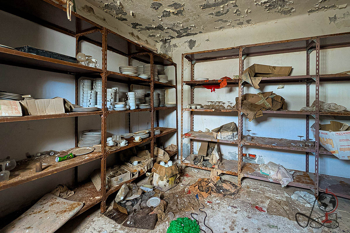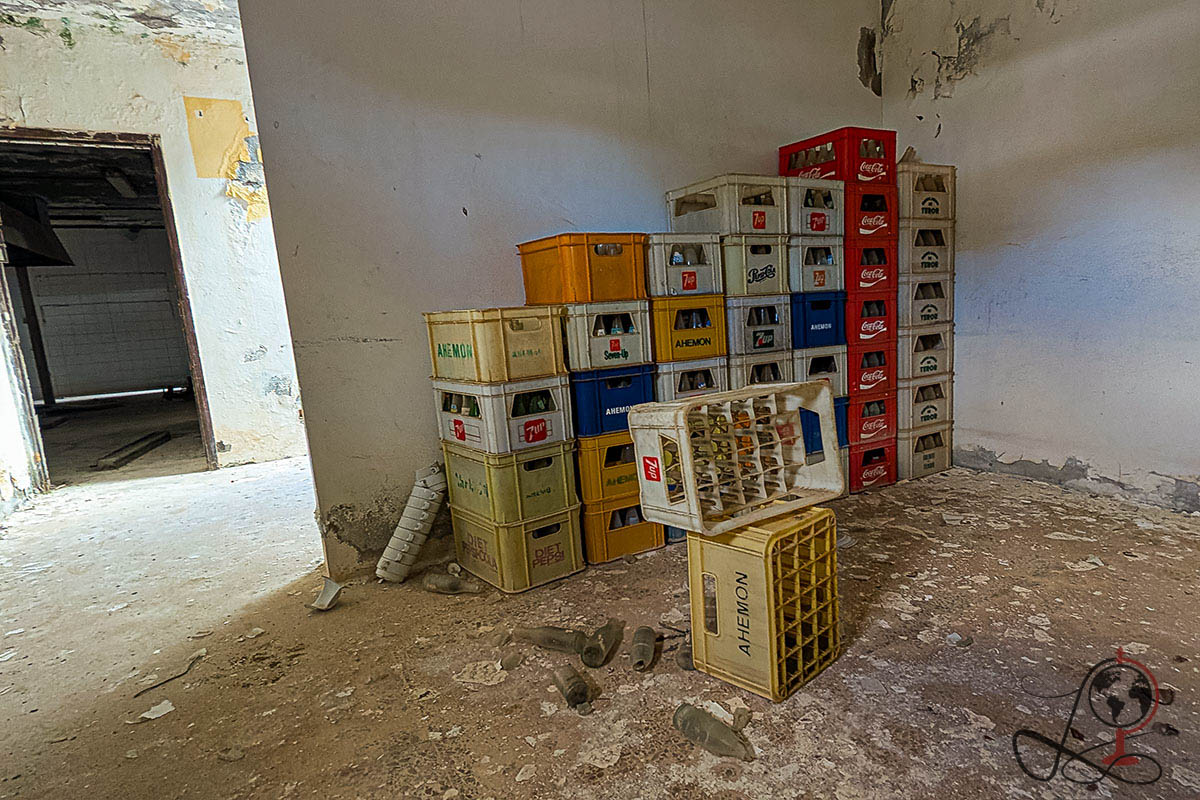 Im Inneren finden sich Räume, die sehr deutlich auf Gastronomie hinweisen: Ein großer Bereich mit Bar und Thekenform, dazu ein Raum mit Regalen voller Teller, Tassen und Gläser, wie man es aus Lager oder Küchenbereichen kennt. In einem weiteren Raum steht ein großes, blaues Gerät mit Bedienfeld, das wie ein Spielautomat oder eine Steuertechnik aus dem Gästebetrieb wirkt. Kleine Details wie eine runde Scheibe mit der Aufschrift Coca Cola geben dem Ort zusätzlich Charakter, auch wenn ihre ursprüngliche Funktion nicht mehr eindeutig zuzuordnen ist.