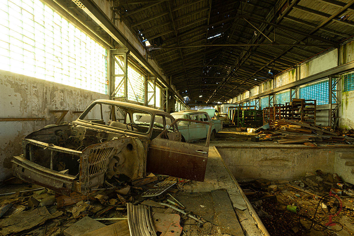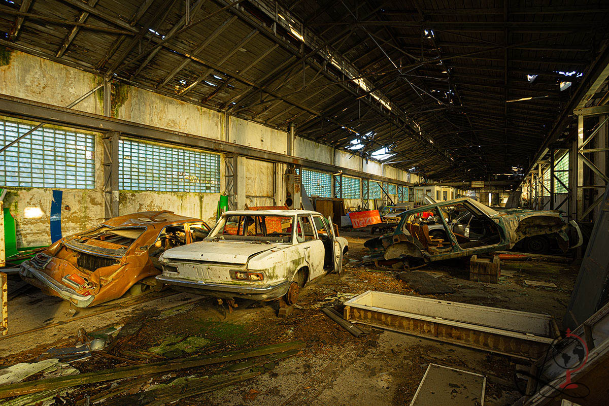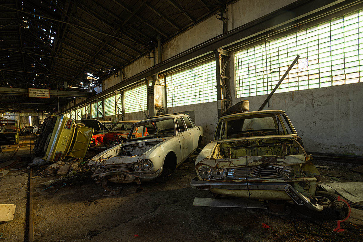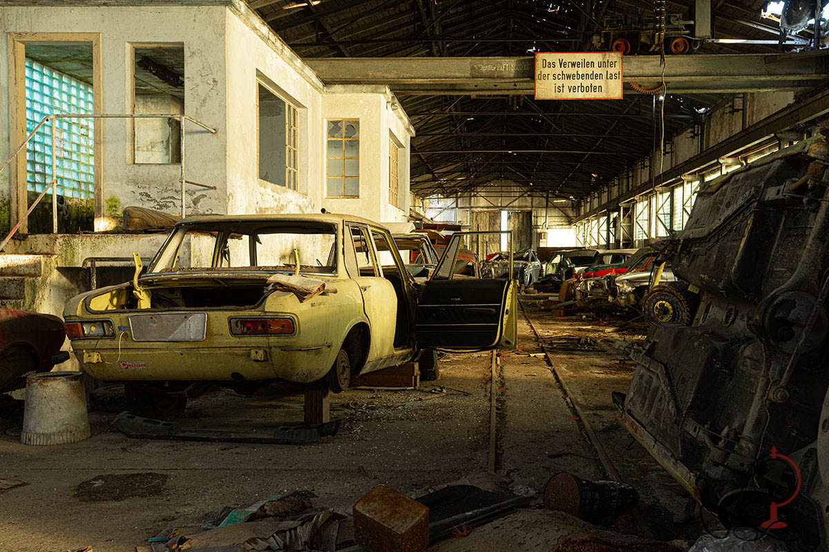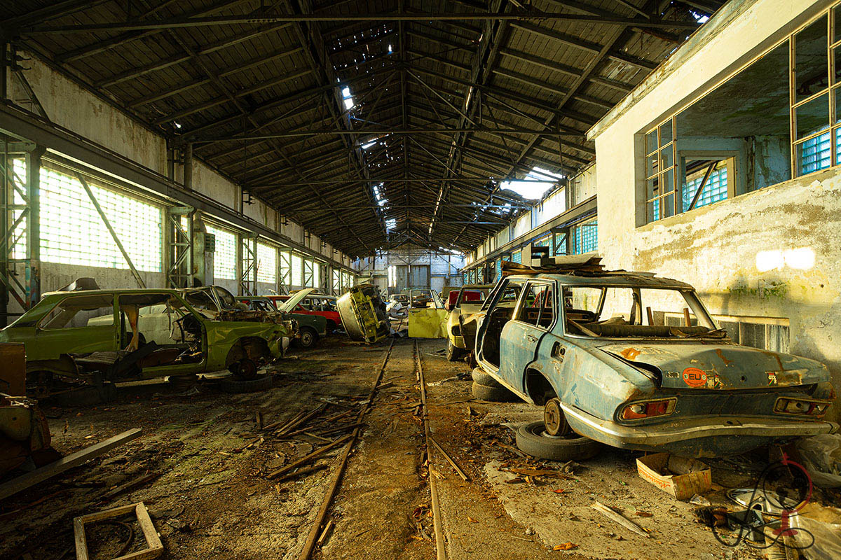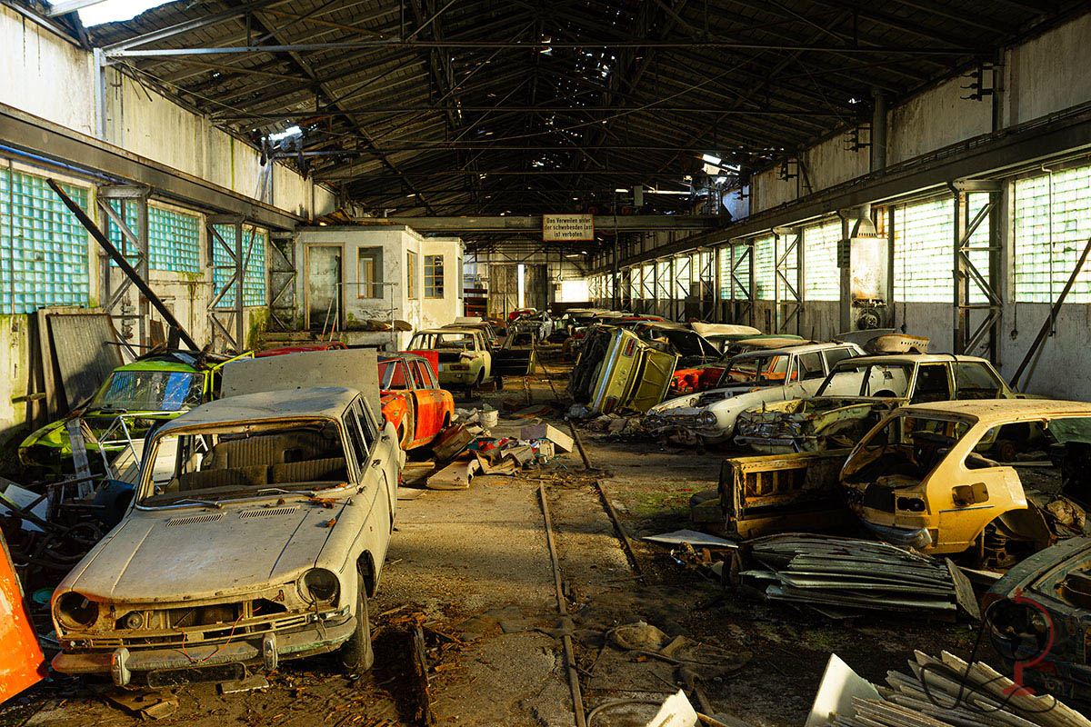 Die Halle wirkt wie ein Kirchenschiff aus Beton, Stahlträgern und langen Fensterbändern. Im Boden verlaufen Schienen, die den Raum wie eine Achse gliedern. Dazwischen stehen Fahrzeuge, viele davon nur noch als Karossen. Türen fehlen, Hauben sind offen, Sitze und Innenräume sind ausgeräumt. Überall liegen Teile und Materialreste, als wäre ein Arbeitsprozess mitten im Takt stehen geblieben.