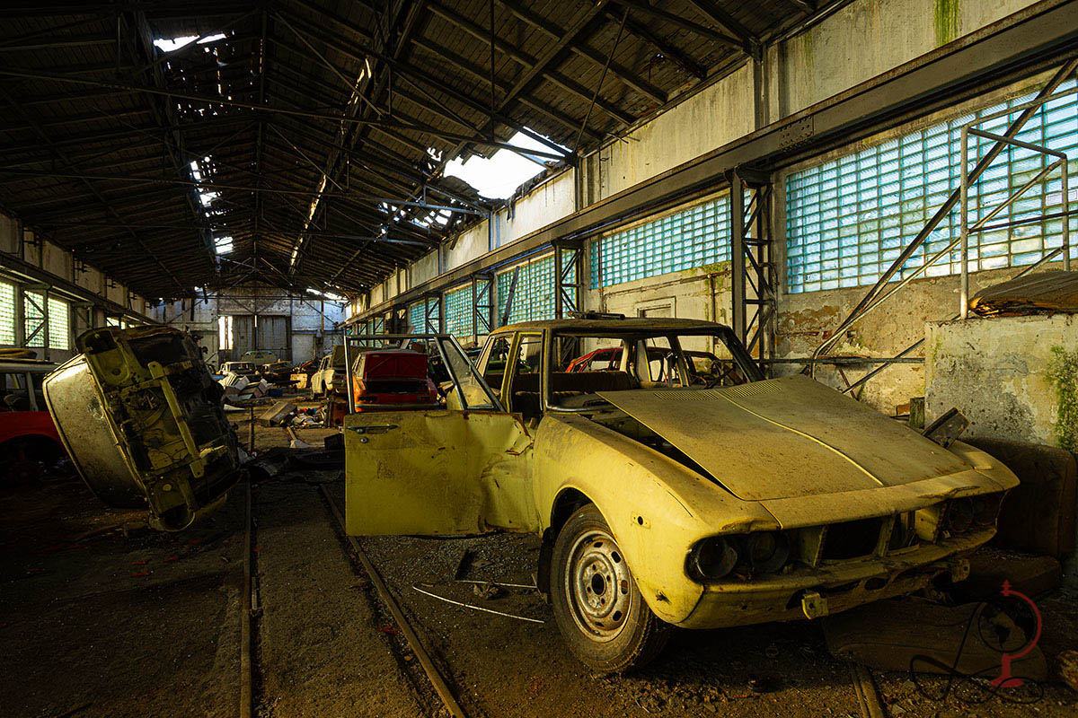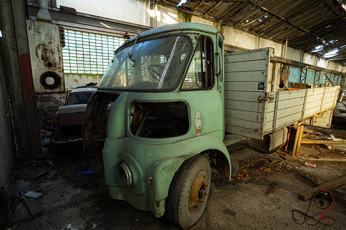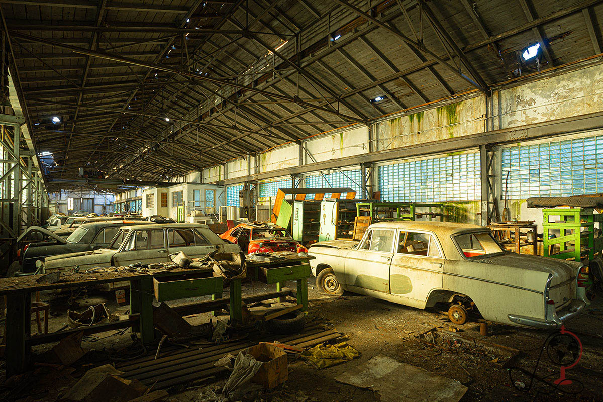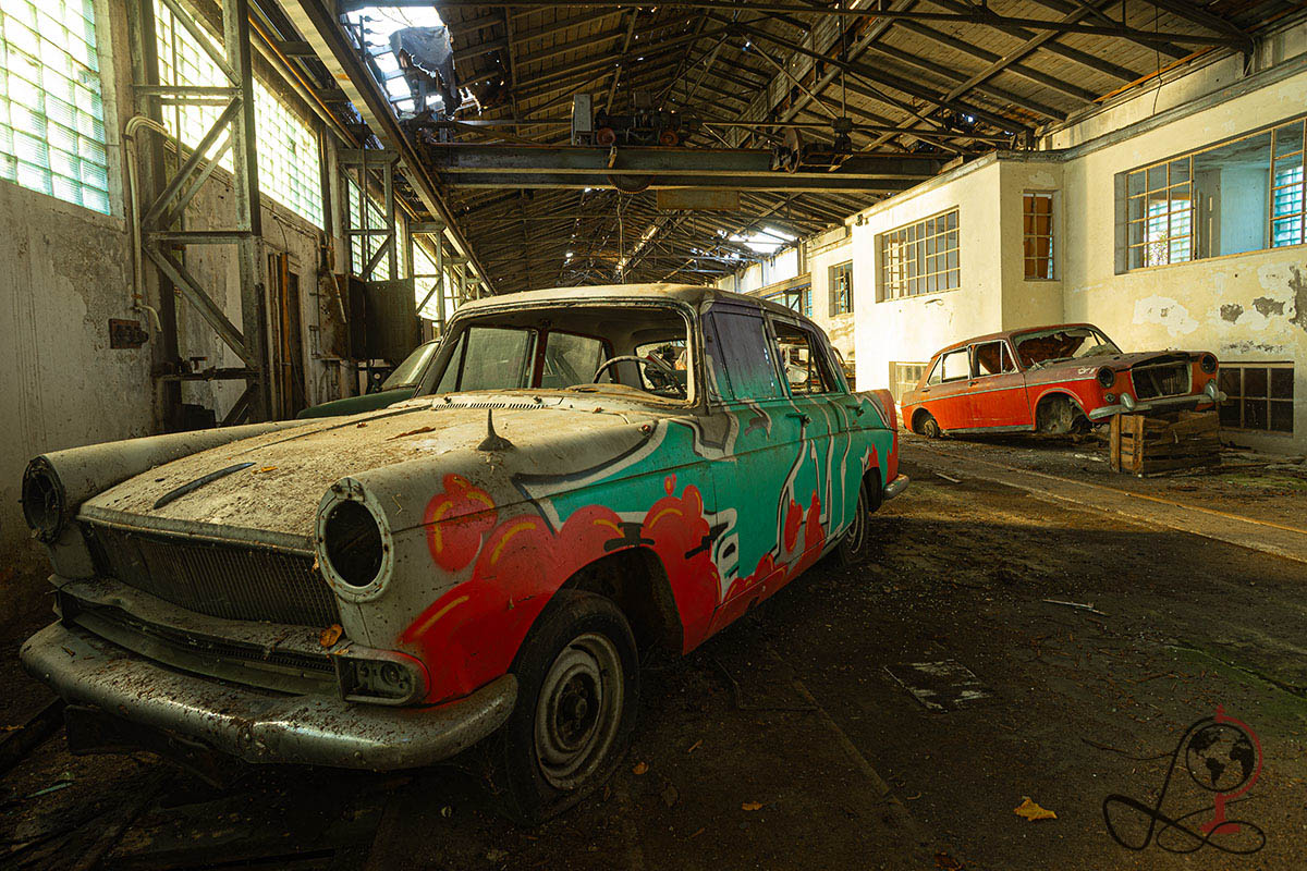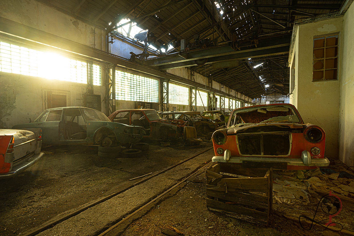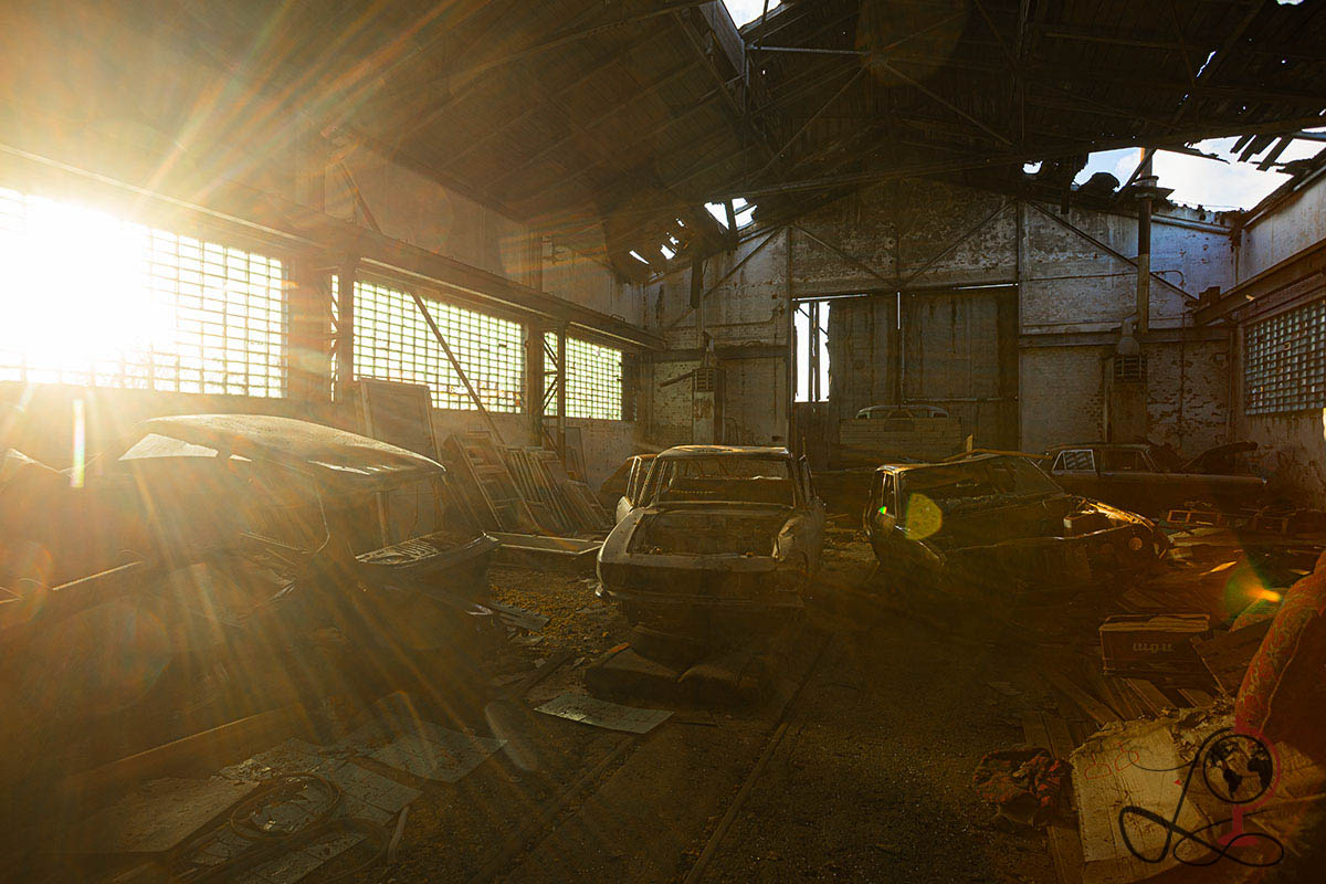 Die Halle wirkt wie ein Kirchenschiff aus Beton, Stahlträgern und langen Fensterbändern. Im Boden verlaufen Schienen, die den Raum wie eine Achse gliedern. Dazwischen stehen Fahrzeuge, viele davon nur noch als Karossen. Türen fehlen, Hauben sind offen, Sitze und Innenräume sind ausgeräumt. Überall liegen Teile und Materialreste, als wäre ein Arbeitsprozess mitten im Takt stehen geblieben.
