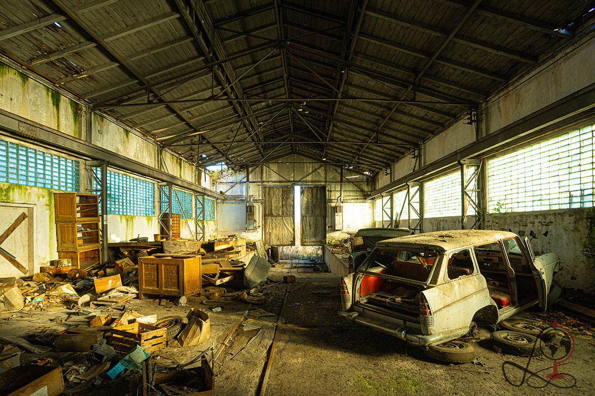 Der Ort lebt vom Kontrast. Oben die klare Industriearchitektur, unten das chaotische Ende einer Werkstattwelt. Zwischen Trägern und Glasbausteinen sammeln sich Rost, Staub und zerfallene Strukturen. Genau darin liegt die Kraft dieser Szene. Alles ist sichtbar, nichts ist glatt.