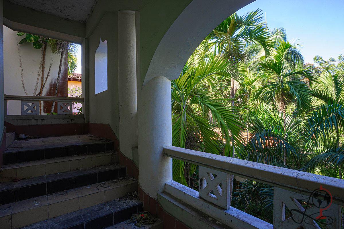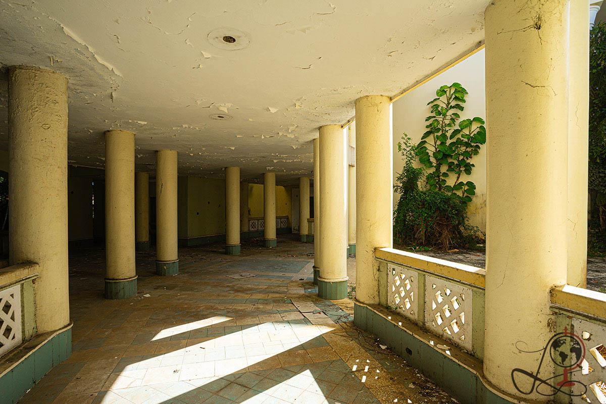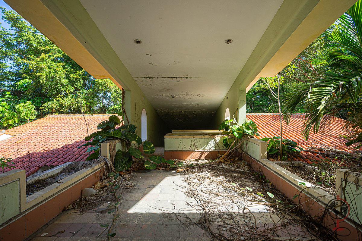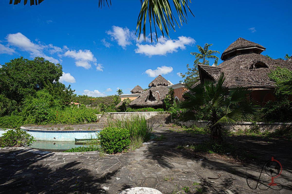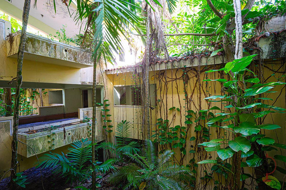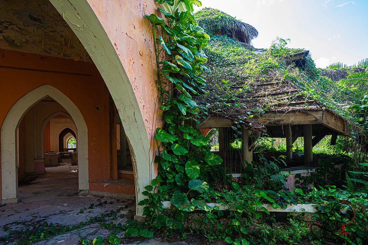Das tropische Klima beschleunigt den Zerfall erheblich. Feuchtigkeit, Salzluft und Vegetation greifen Beton, Holz und Metall schnell an. Pflanzen wachsen durch Fliesen und Mauerspalten, Wurzeln sprengen Böden auf, und Insekten wie Termiten zerstören tragende Holzelemente von innen. Besonders auffällig ist, wie stark die Natur die offenen Säulengänge und Rotunden inzwischen zurückerobert hat. Zwischen Palmen, Lianen und überwucherten Pools entsteht ein Kontrast aus architektonischer Großzügigkeit und vollständiger Aufgabe.