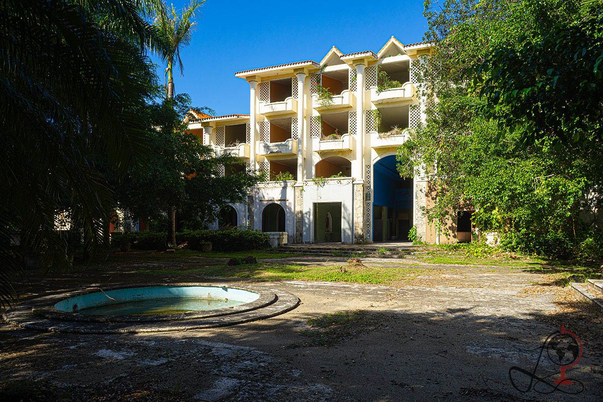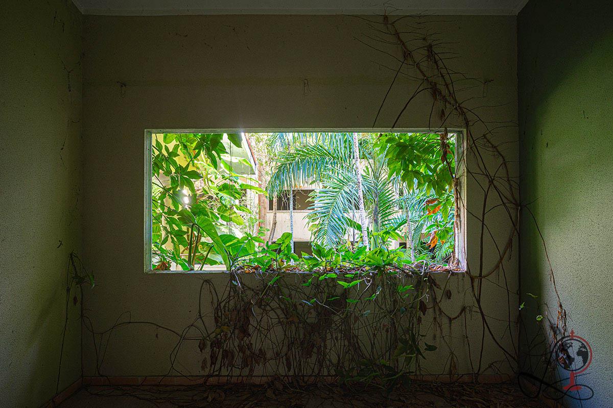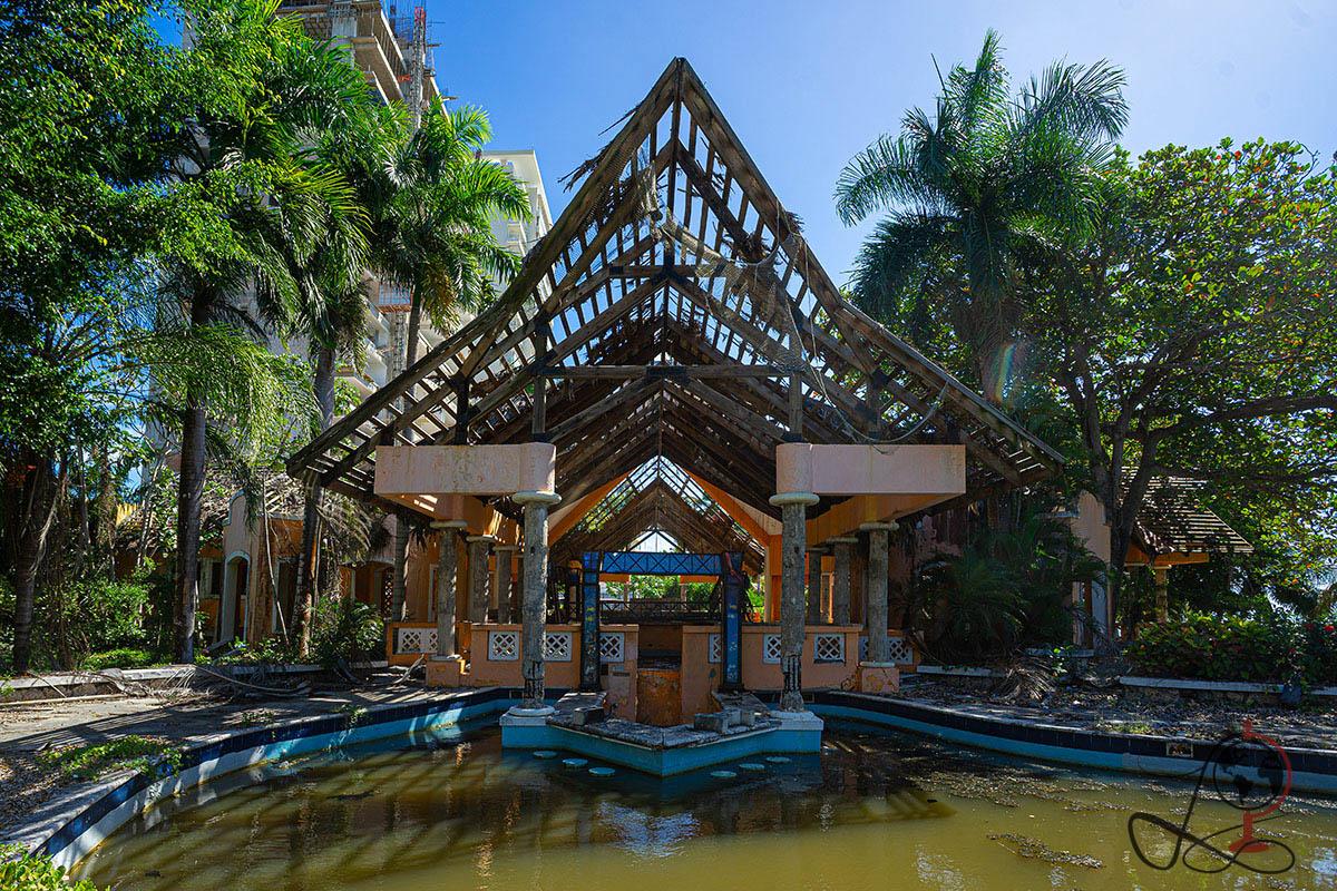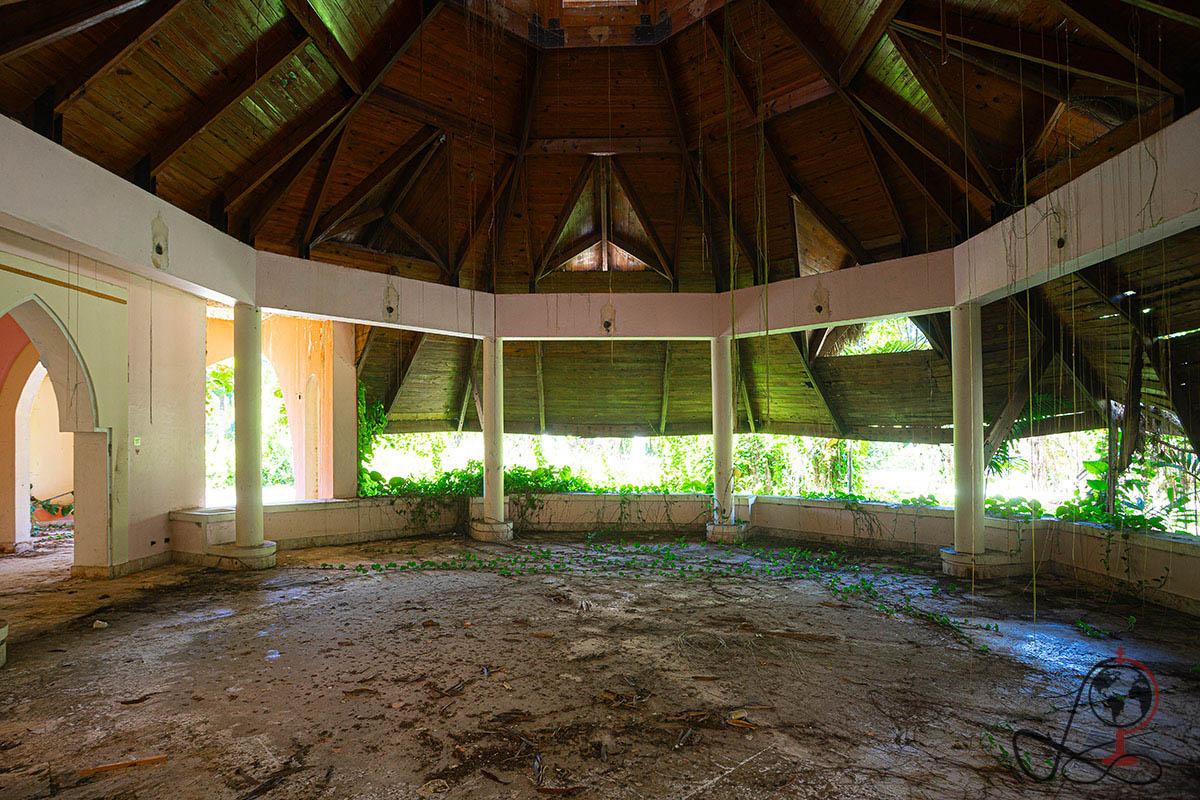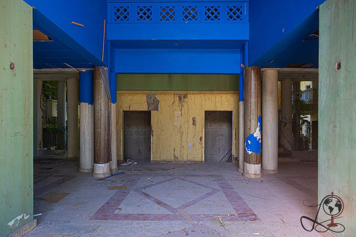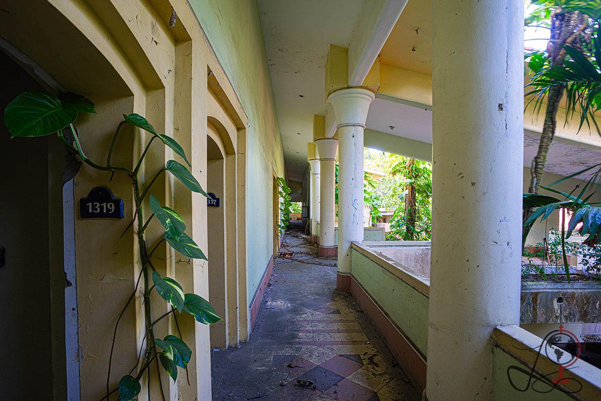 Das tropische Klima beschleunigt den Zerfall erheblich. Feuchtigkeit, Salzluft und Vegetation greifen Beton, Holz und Metall schnell an. Pflanzen wachsen durch Fliesen und Mauerspalten, Wurzeln sprengen Böden auf, und Insekten wie Termiten zerstören tragende Holzelemente von innen. Besonders auffällig ist, wie stark die Natur die offenen Säulengänge und Rotunden inzwischen zurückerobert hat. Zwischen Palmen, Lianen und überwucherten Pools entsteht ein Kontrast aus architektonischer Großzügigkeit und vollständiger Aufgabe.