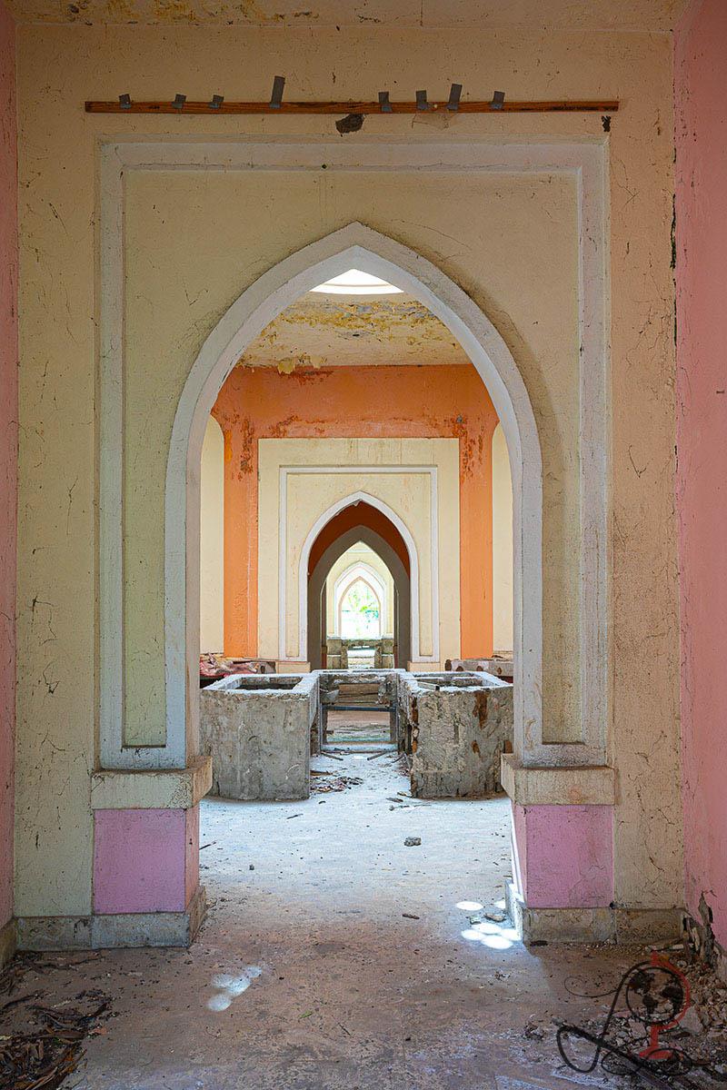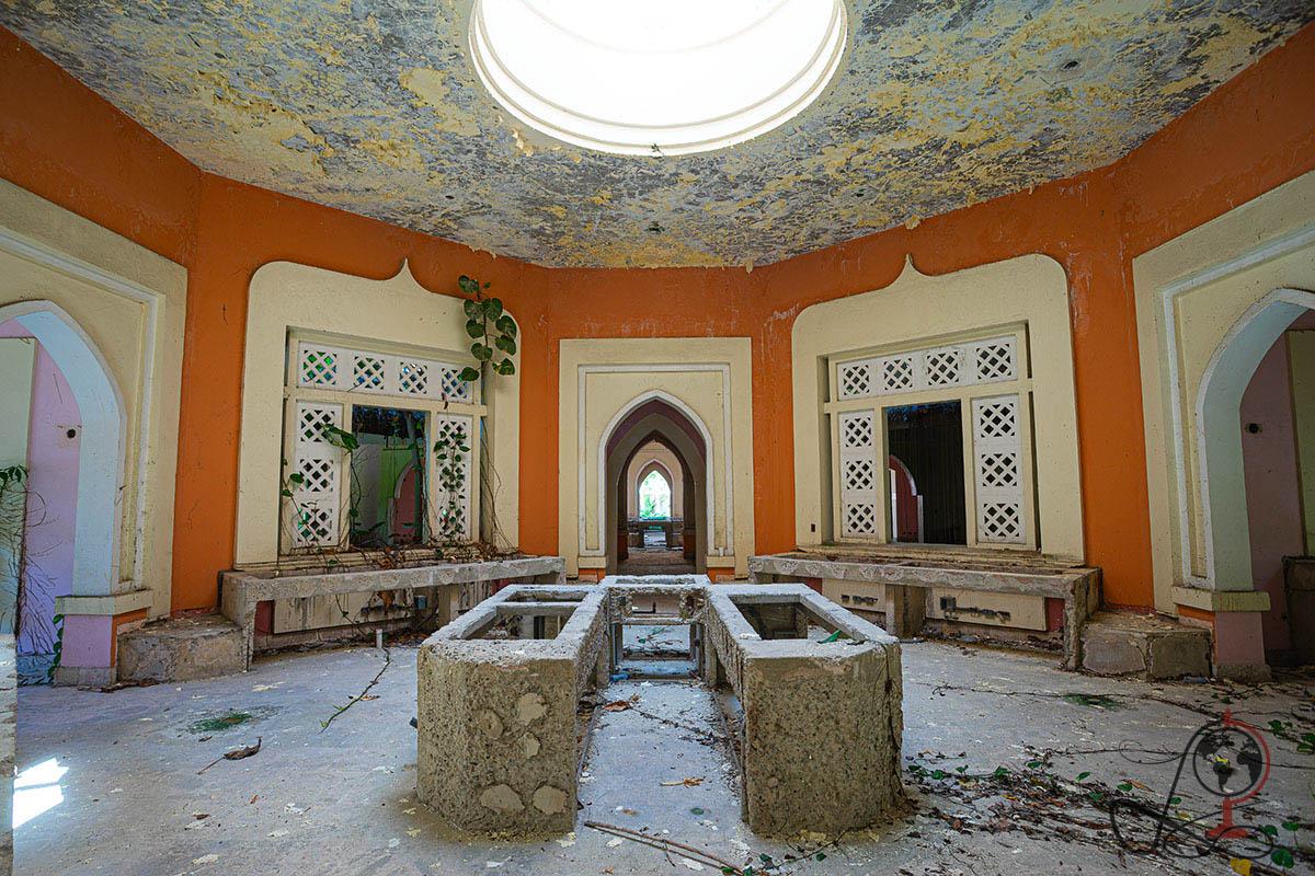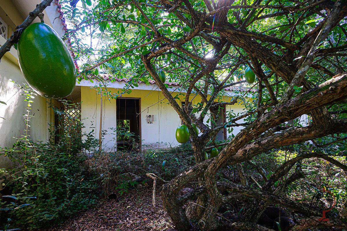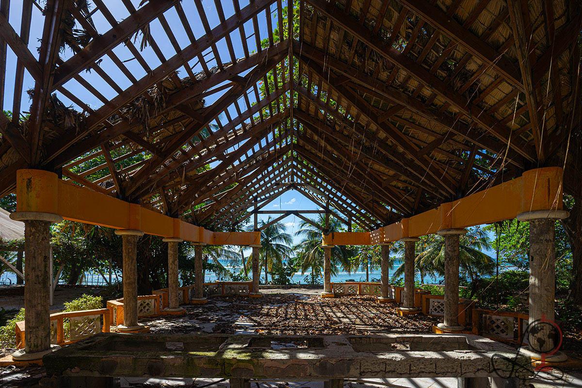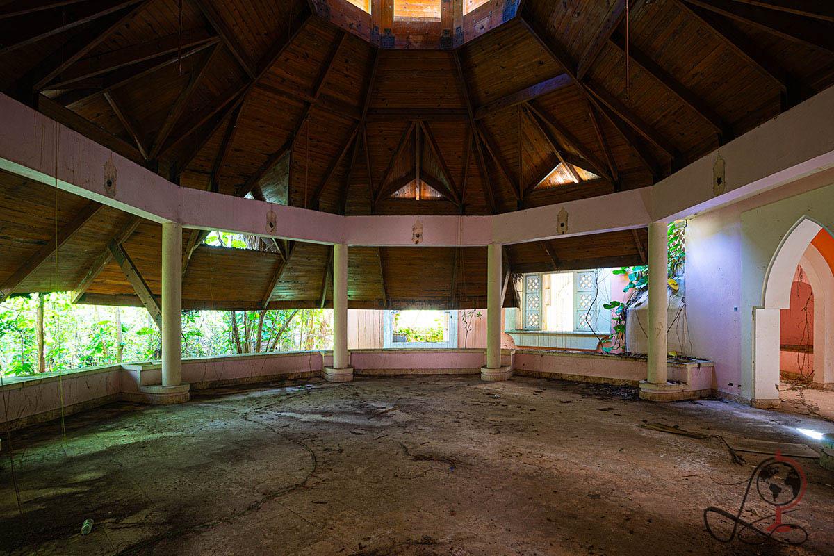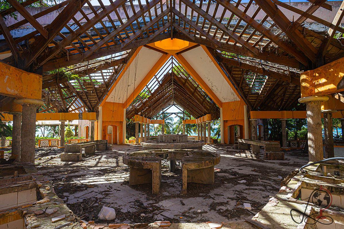 Das tropische Klima beschleunigt den Zerfall erheblich. Feuchtigkeit, Salzluft und Vegetation greifen Beton, Holz und Metall schnell an. Pflanzen wachsen durch Fliesen und Mauerspalten, Wurzeln sprengen Böden auf, und Insekten wie Termiten zerstören tragende Holzelemente von innen. Besonders auffällig ist, wie stark die Natur die offenen Säulengänge und Rotunden inzwischen zurückerobert hat. Zwischen Palmen, Lianen und überwucherten Pools entsteht ein Kontrast aus architektonischer Großzügigkeit und vollständiger Aufgabe.