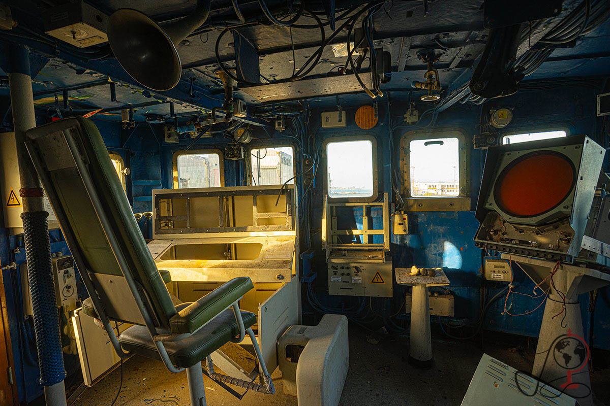 Durch die Fenster der Brücke fiel warmes Licht. Draußen lagen weitere Einheiten, dazu die Kulisse aus Kaimauern, Hallen und Hafenflächen. Drinnen dagegen herrschte diese typische Mischung aus Technik und Leere. Schalter, Anzeigen, Kabel, alles wirkte so, als wäre die Routine nur kurz unterbrochen. Genau dieser Moment zwischen Funktion und Aufgabe macht solche Orte so stark.