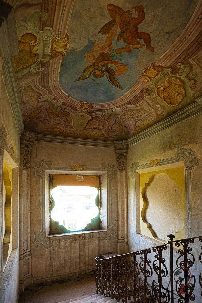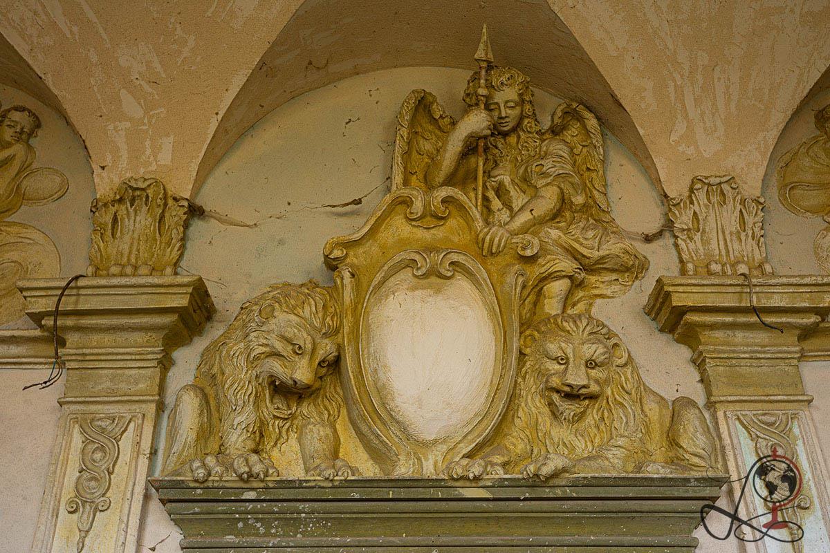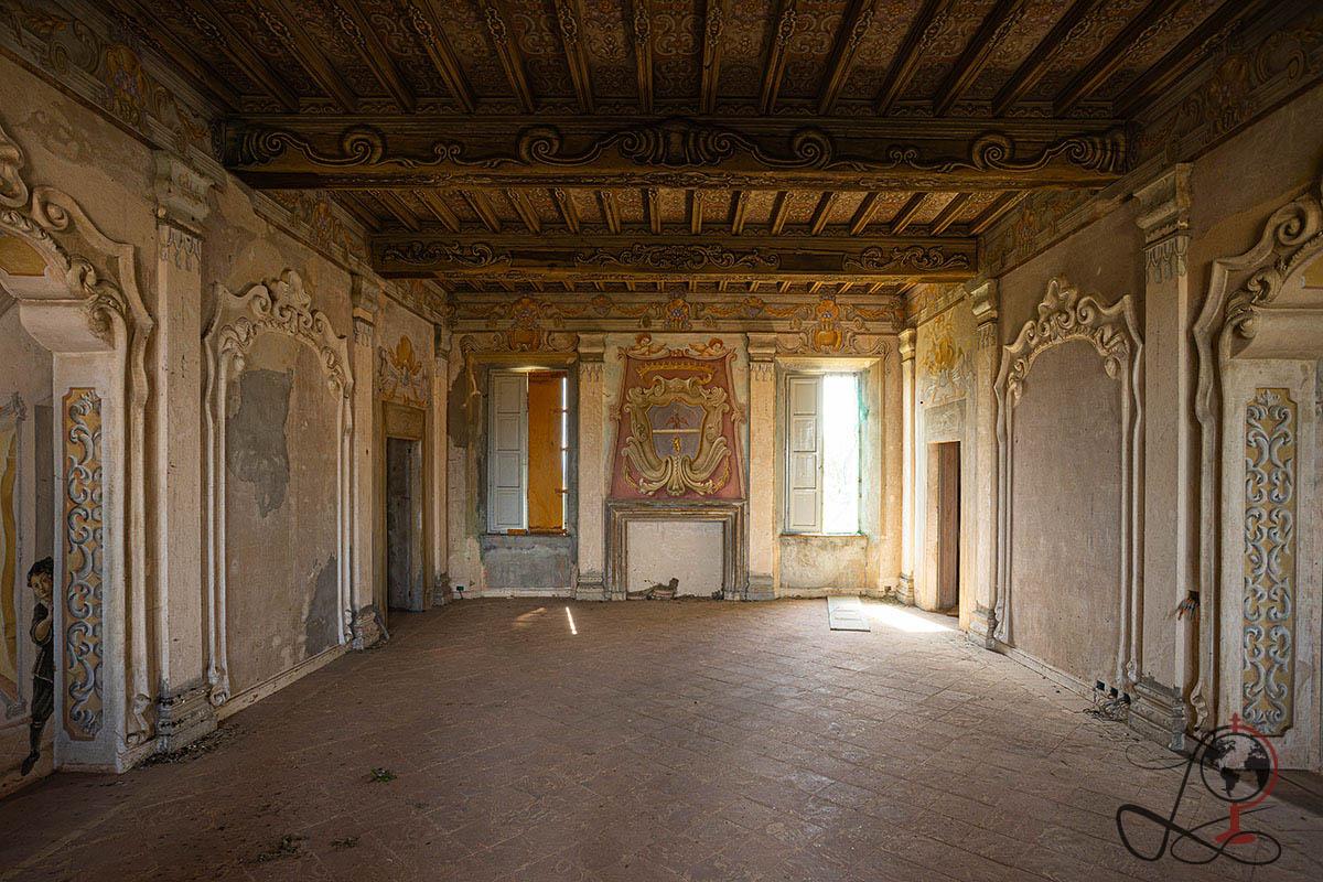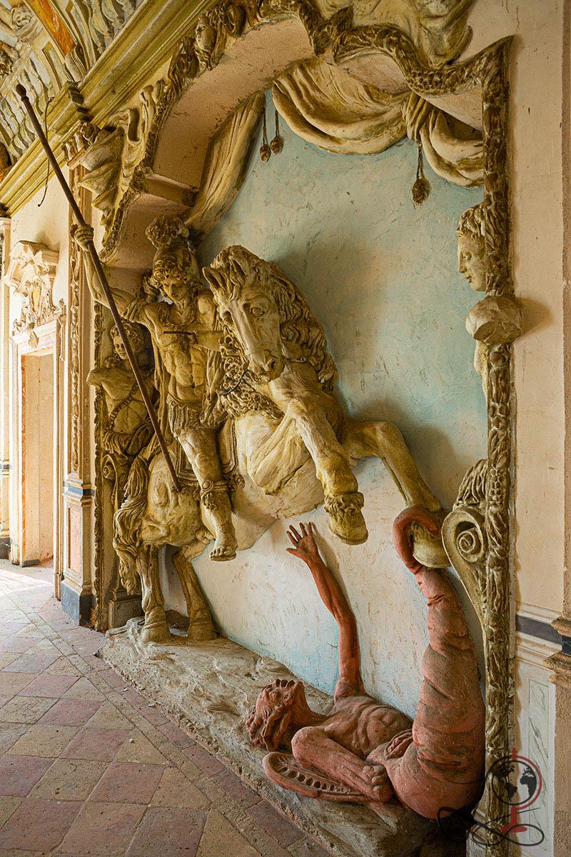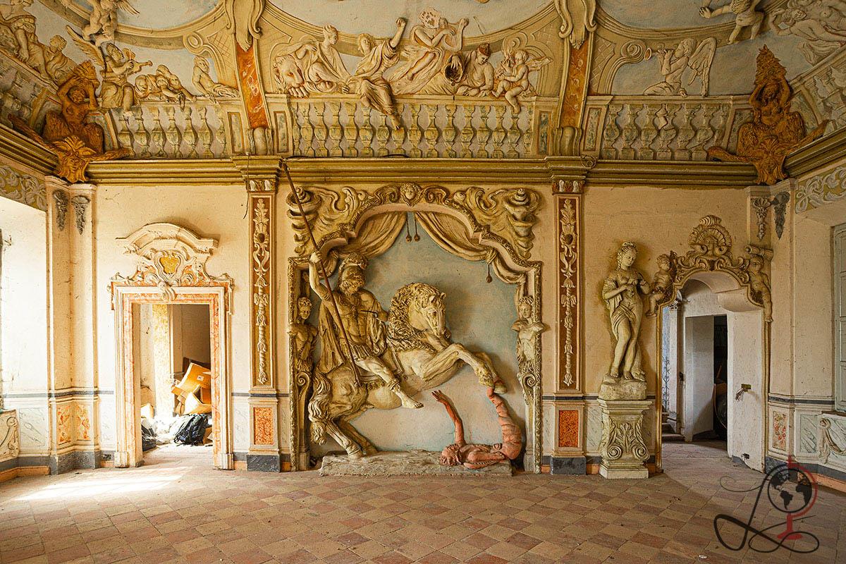 Die Kombination aus bemalter Scheinarchitektur, plastischen Reiterdarstellungen und mythologischen Szenen weist klar auf eine repräsentative Nutzung hin. Der Name „Cavaliere“ wird in Urbex Kreisen häufig mit der zentralen Reiterszene im Hauptsaal in Verbindung gebracht, die einen bewaffneten Reiter über einer besiegten Figur zeigt.